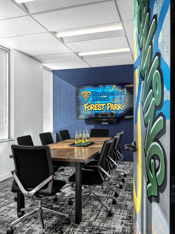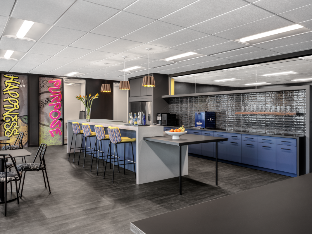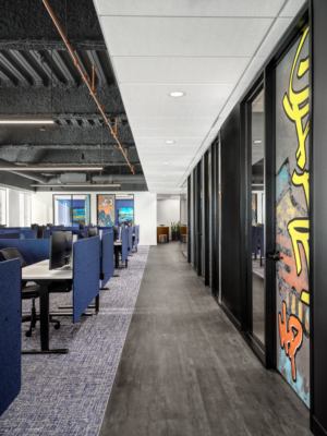 With design direction led by Nehring Design, MBI delivered a workplace suite inspired by the high-performance world of Formula 1 racing. The furniture package was value-engineered to align with budget while still supporting a bold, elevated aesthetic. The interior carries a street-inspired vibe, layered with bright color, graffiti-style graphic moments, and layered finishes bring energy to the space without losing a clean, professional feel — and an unmistakably cool atmosphere.