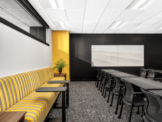 Across the floor, HON Gravitation Beam workstations provide height adjustability for each user while maintaining an open, airy layout. In the training room, a Stylex bench supports comfortable overflow seating and reinforces the design’s linear, “track-inspired” visual language. Custom walnut conference tables by Saint Louis Tables add warmth to conference spaces and highlight locally made craftsmanship.